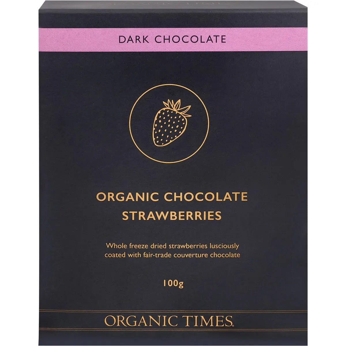 Organic Times Chocolate Strawberries. Freeze-dried, organic strawberries lusciously coated in organic & fair-trade dark chocolate. Free from GMOs, Palm-oil and nasties.- Certified Organic