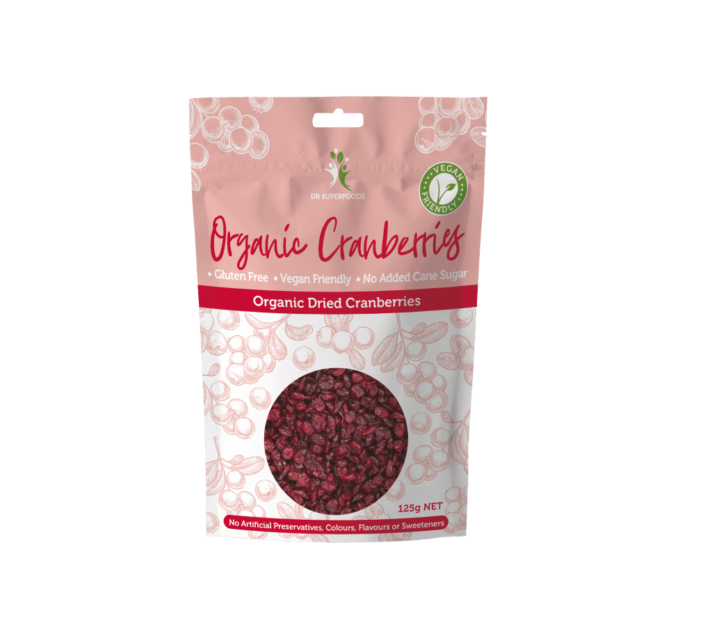 Organic whole dried cranberries are a Superfood organically grown and sourced from USDA certified organic suppliers in the USA. There are no added artificial preservatives, colours, flavours or sweeteners. Cranberries are rich in antioxidants and contain many other beneficial nutrients. These cranberries are infused with apple juice concentrate, making them refined cane sugar free. Being whole dried cranberries, they are deliciously juicy and plump!