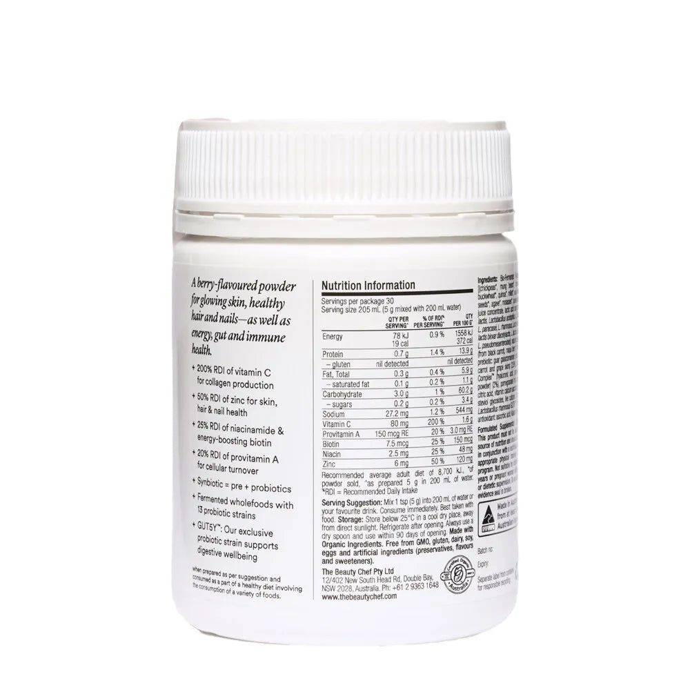 Ingredients: Bio-Fermented Nutrient Blend with Flora Culture™ [(chickpeas*, mung beans*, brown rice*, sweet potato*, lentils*, buckwheat*, quinoa*, millet*, sea minerals, pepitas*, linseed*, sunflower seeds*, agave*, molasses*, queen garnet plum, ginger rhizome*, lemon juice concentrate, lactic acid starter culture (Bifidobacterium infantis, B. lactis, Lactobacillus acidophilus, L. delbrueckii sub. lactis, L. fermentum, L. paracasei, L. rhamnosus, Lactococcus lactis sub.cremoris, L. lactis sub. lactis biovar diacetylactis, L. lactis sub. lactis, Leuconostoc mesenteroides, L. pseudomesenteroides)), natural colour: turmeric rhizome*, anthocyanins (from black carrot), maqui berry*, vitamin: nicotinamide, biotin] (80.3%), prebiotic: guar galactomannan; natural colour: anthocyanins (from black carrot and grape skins) (2.8%), natural wild berry flavour, Hyaluronic Complex™ (hyaluronic acid, grapeseed extract, sea buckthorn juice powder) (2%), pomegranate fruit peel extract (1.9%), acidity regulator: citric acid, vitamin: calcium ascorbate, mineral: zinc ascorbate, sweetener: steviol glycosides, live cultures: Saccharomyces boulardii (0.47%) and Lactobacillus rhamnosus GUT5Y™ (0.1%), vitamin: natural beta carotene, antioxidant: ascorbic acid, Kakadu plum (0.002%). *organic ingredients