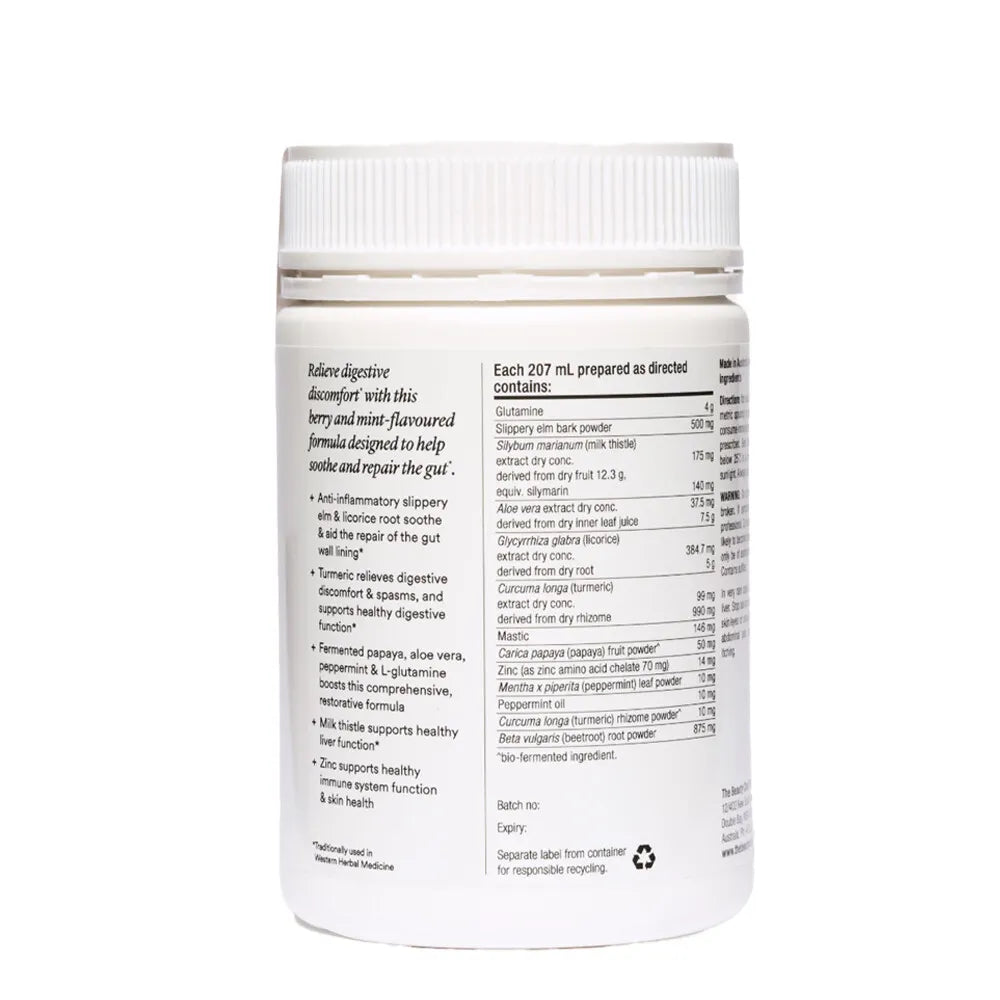 Ingredients: Each 7g dose contains: glutamine 4g, slippery elm bark powder 500mg, Silybum marianum (milk thistle) extract dry conc. 175mg derived from dry fruit 12.3g equiv. silymarin 140mg, Aloe vera extract dry conc. 37.5mg derived from dry inner leaf juice 7.5g, Glycyrrhiza glabra (licorice) extract dry conc. 384.7mg derived from dry root 5g, Curcuma longa (turmeric) extract dry conc. 99mg derived from dry rhizome 990mg, Mastic 146mg, Carica papaya (papaya) fruit powder^ 50mg, zinc (as zinc amino acid chelate 70mg) 14mg, Mentha x piperita (peppermint) leaf powder 10mg, peppermint oil 10mg, Curcuma longa (turmeric) rhizome powder^ 10mg, Beta vulgaris (beetroot) root powder 875mg. ^bio-fermented ingredient
