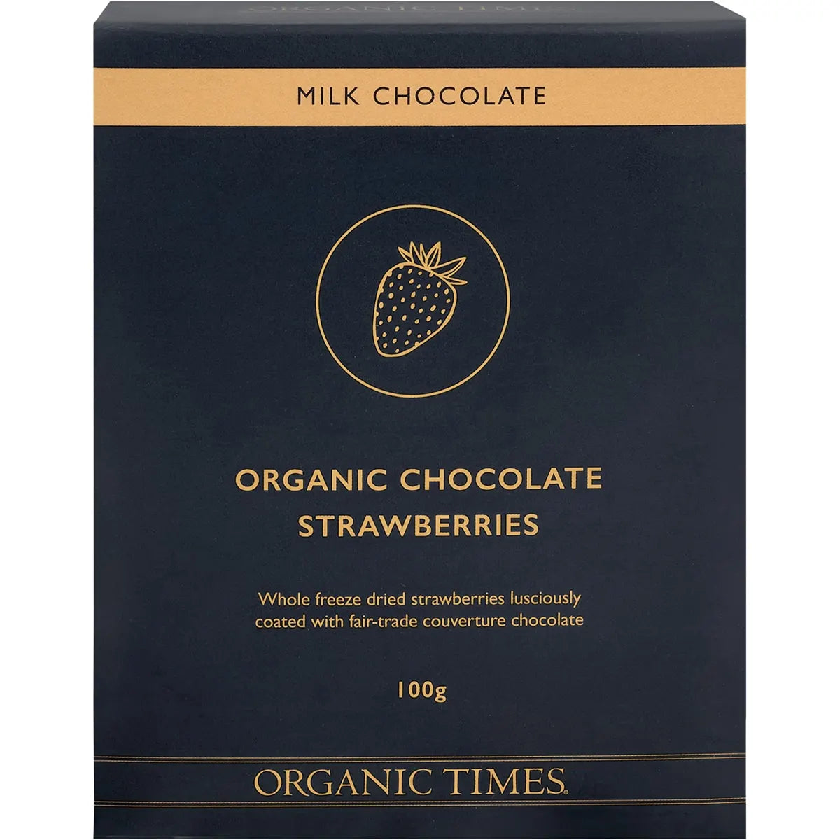 Organic Times Milk Chocolate Strawberries. Freeze-dried strawberries lusciously coated in organic, fair-trade chocolate. Free from GMOs, Palm-oil and nasties.