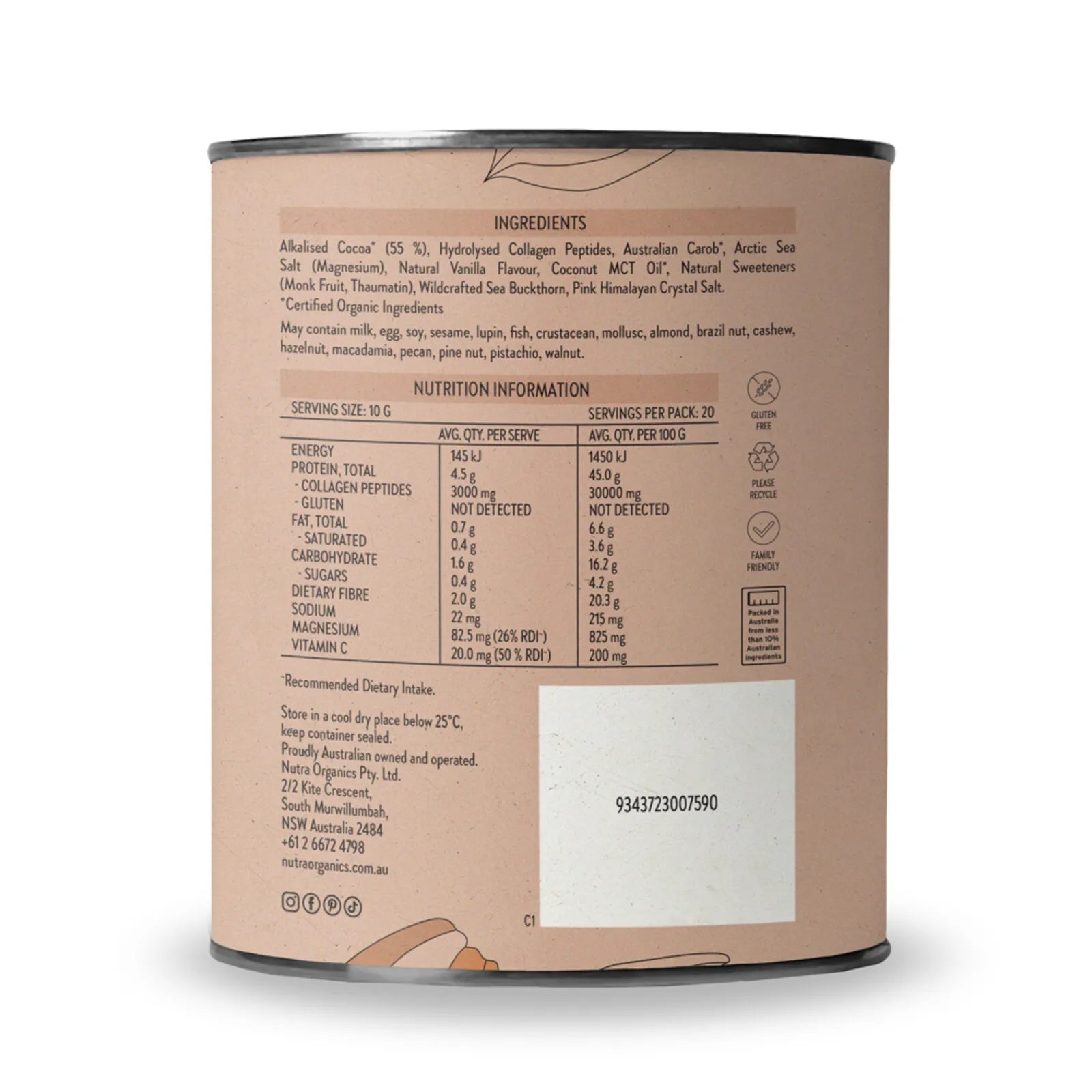 Ingredients: Alkalised Cocoa* (55 %), Hydrolysed Collagen Peptides, Australian Carob*, Arctic Sea Salt (Magnesium), Natural Vanilla Flavour, Coconut MCT Oil*, Natural Sweeteners (Monk Fruit, Thaumatin), Wildcrafted Sea Buckthorn, Pink Himalayan Crystal Salt. *Certified Organic Ingredients May contain milk, egg, soy, sesame, lupin, fish, crustacean, mollusc, almond, brazil nut, cashew, hazelnut, macadamia, pecan, pine nut, pistachio, walnut