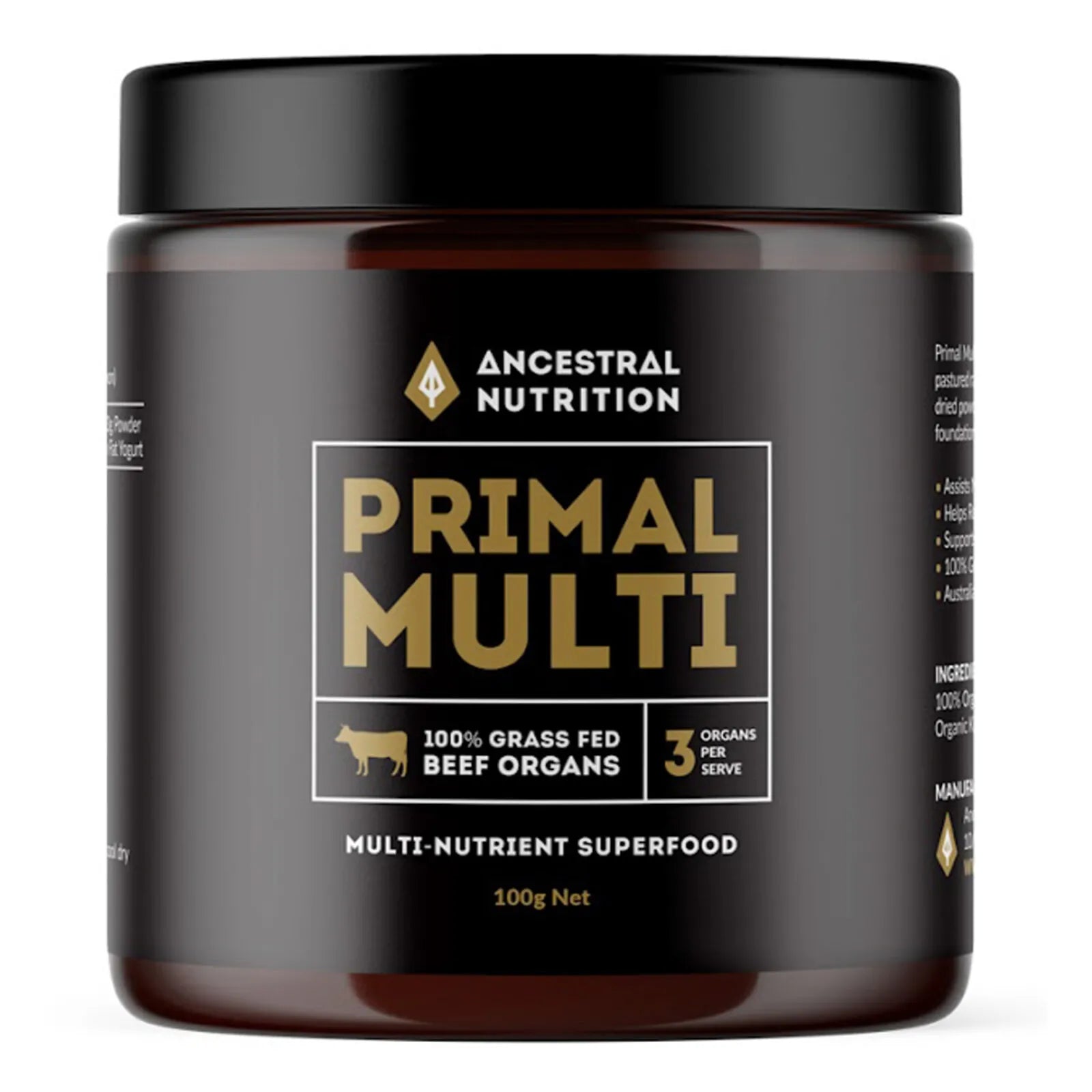 Primal Multi by Ancestral Nutrition offers three of the most treasured organs from pastured raised Tasmanian cattle in the convenience of beef organ capsules and beef organ powder. The blend of liver, heart and kidney offers key nutrients including CoQ10, B12 and selenium to support overall health, vitality and energy.
