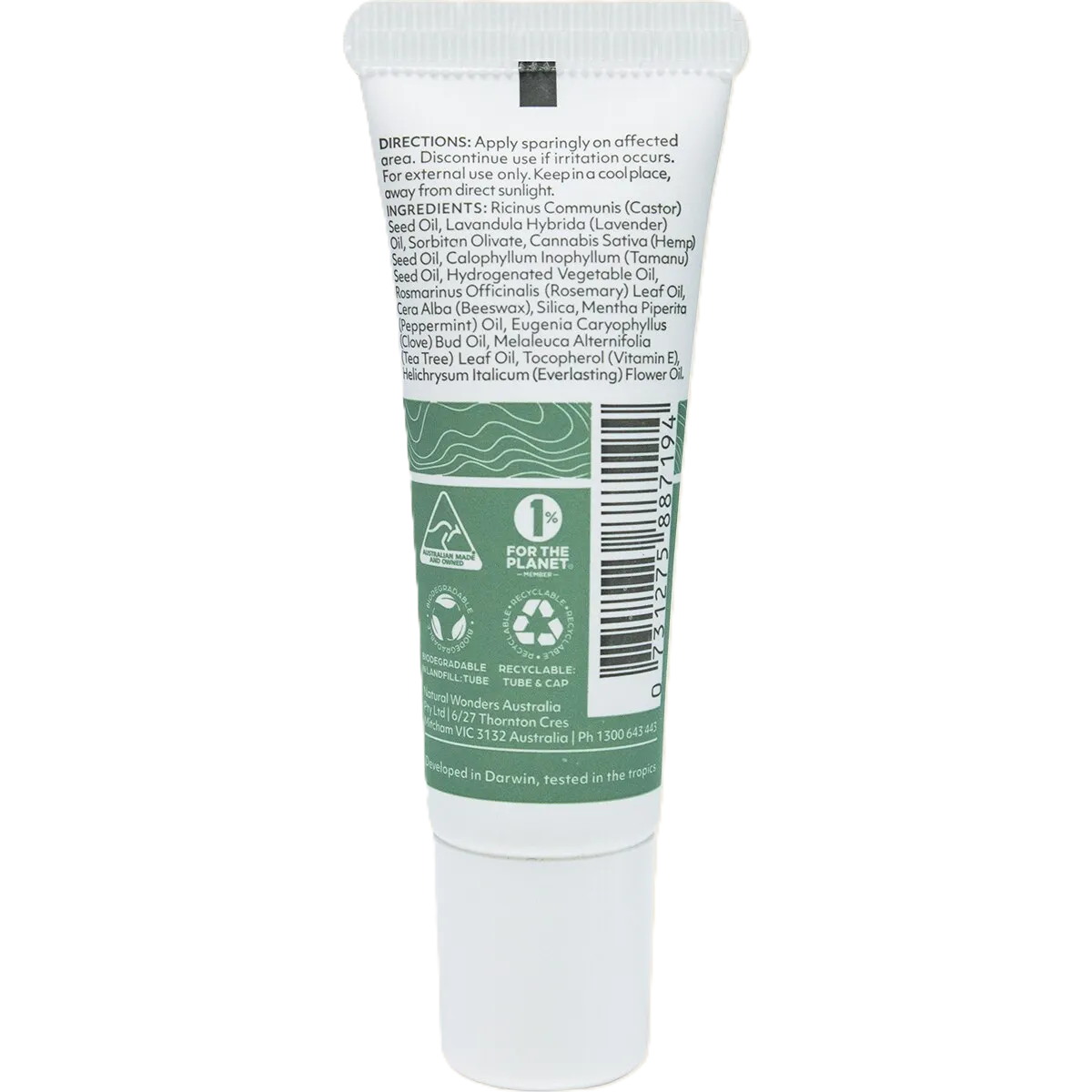 Ricinus Communis (Castor) Seed Oil Oil*, Lavandula Hybrida (Lavender) Oil, Sorbitan Olivate, Cannabis Sativa (Hemp) Seed Oil*, Calophyllum Inophyllum (Tamanu) Seed Oil*, Hydrogenated Vegetable Oil, Rosmarinus Officinalis Leaf (Rosemary) Oil, Cera Alba (Beeswax), Silica, Mentha Piperita (Peppermint) Essential Oil, Eugenia Caryophyllus Bud (Clove) Oil, Melaleuca Alternifolia Leaf (Tea Tree) Oil, Tocopherol (Vitamin E), Helichrysum Italicum Flower Oil. *Certified Organic
