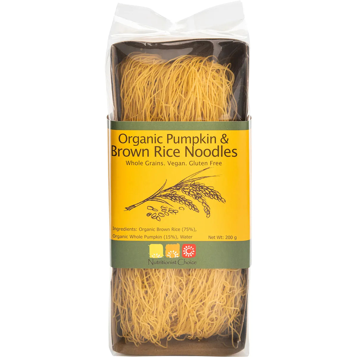 Nutritionist Choice certified organic pumpkin and brown rice noodles are made from whole grain and whole pumpkin. They are convenient and versatile gluten-free noodles that can be mixed into soups, salads, stir-fries or used in place as pasta.